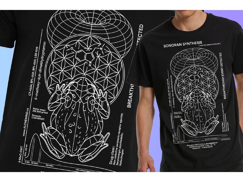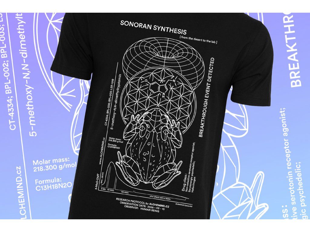 Tričko „Sonoran Synthesis" je dalším kouskem limitované kolekce Alchemind. Design zpracovává vědecký profil látky 5-MeO (5-methoxy-d##met##try###min) jako laboratorní protokol s molekulární strukturou a farmakokinetickým grafem. V centru celé kompozice sedí Bufo alvarius — pouštní ropucha Sonorské pouště, přirozený zdroj této látky. Detaily produktu:Materiál a zpracování