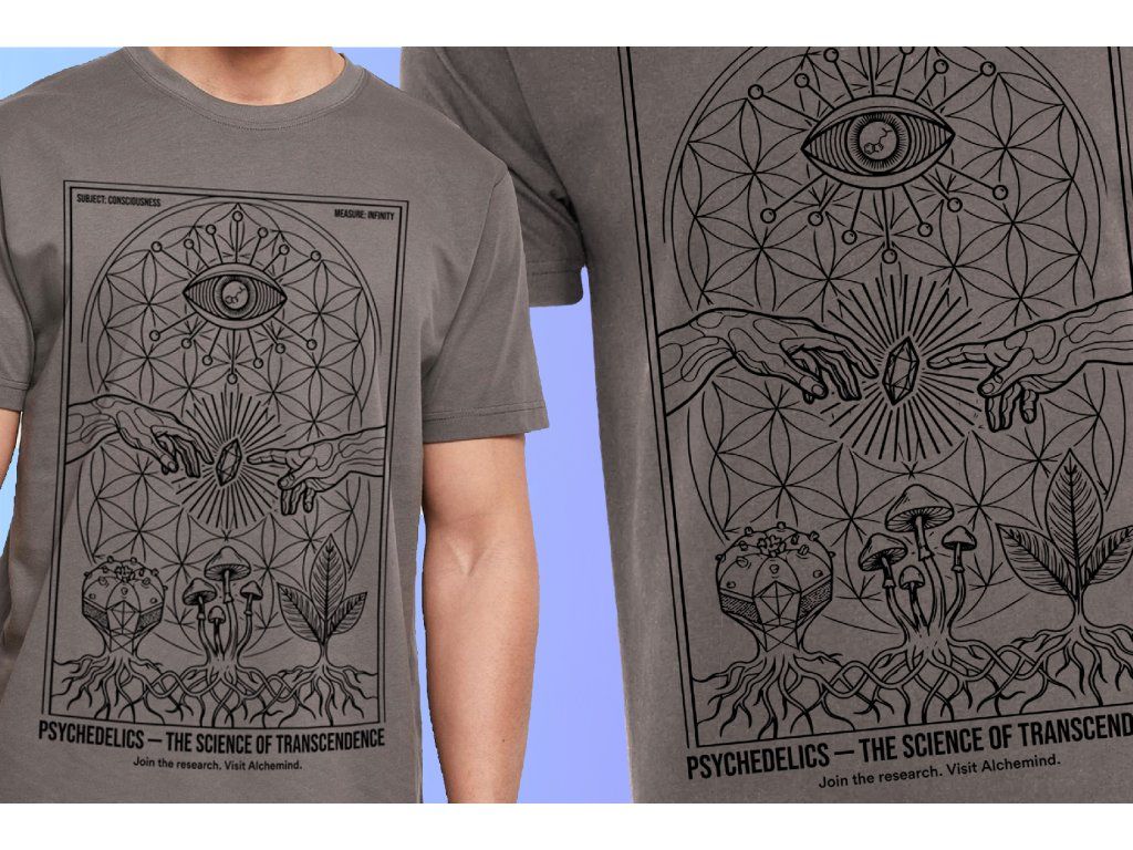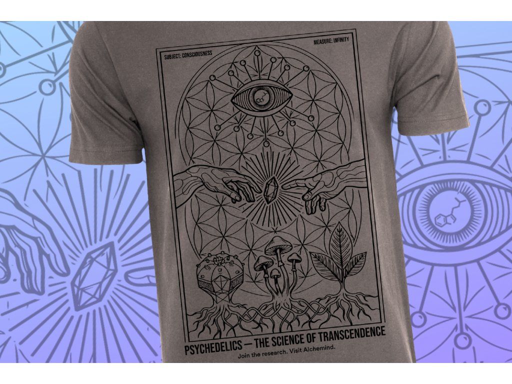 „Psychedelics — The Science of Transcendence." Originální sítotiskový design z dílny Alchemind na kvalitním tričku z 100% bavlny.